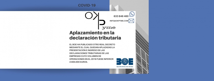 Se ha publicado en el BOE el real decreto-Ley 14/2020 de 14 abril, en el que se amplían los plazos de presentación e ingreso de las declaraciones tributarias de las empresas cuya cifra de negocio en el ejercicio 2019 fuese inferior a 600.000€